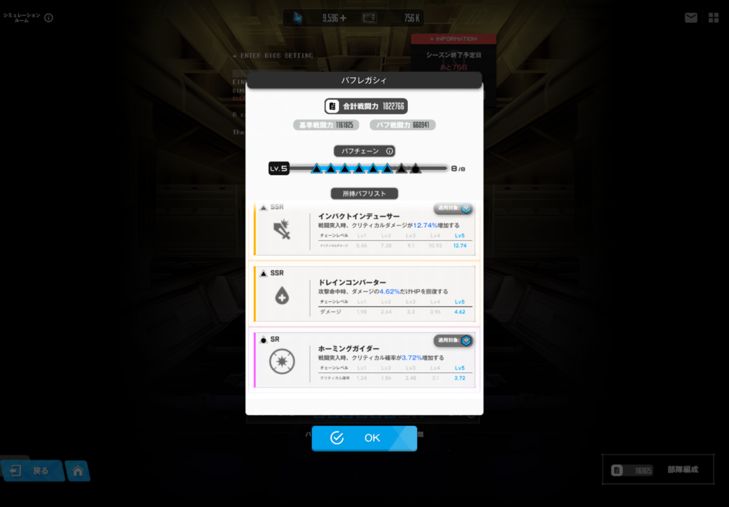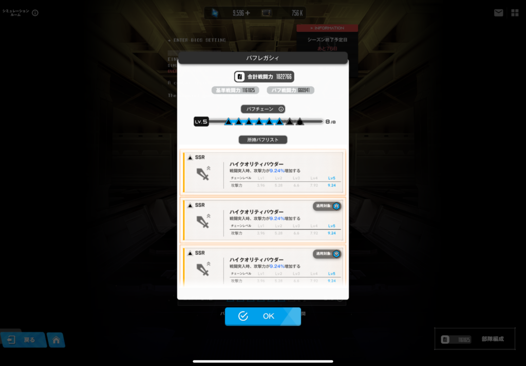 今回の水冷オバクロ∞クリアに使用したバフチェーンの状況としては、以下の画像のような感じになります。