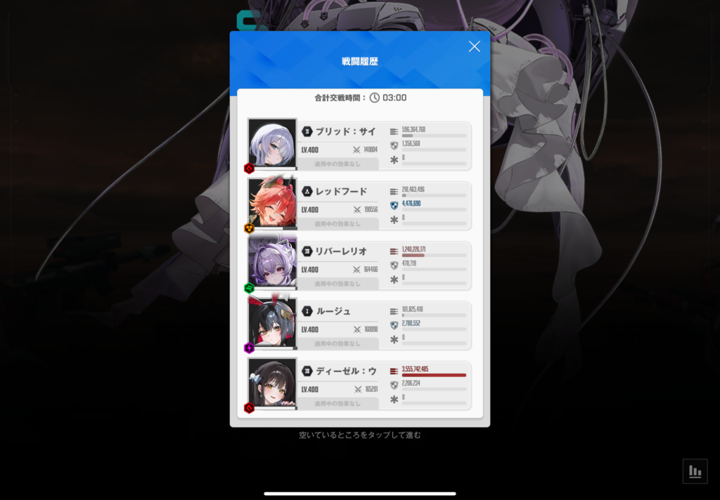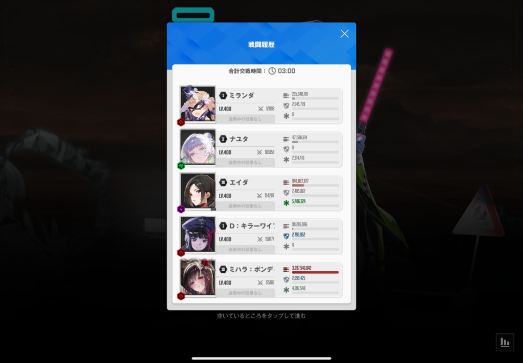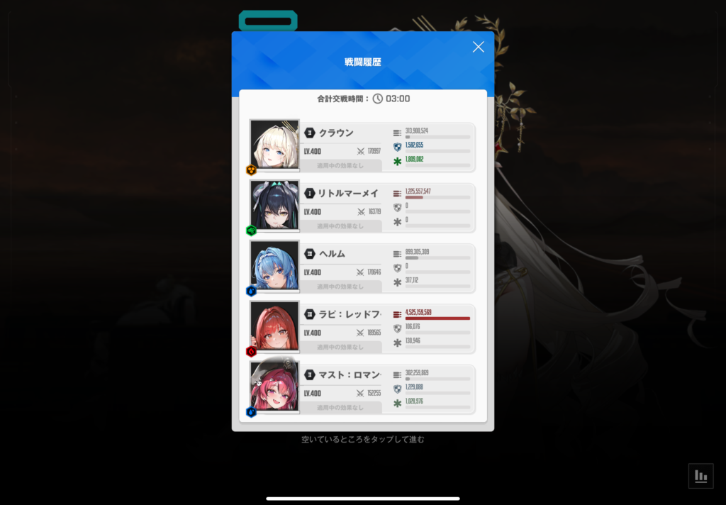 この3人のスコアを見ると、ラピが45億、ミハラが37億、ディーゼルが35億と明らかに他のキャラよりも突出しています。全体との割合で言うと約42%程ですね。スコアの半分近くをこの3人が稼いでくれています。