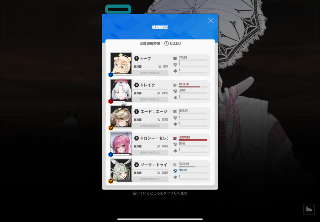 ぎりぎりになって装弾を有利コードに変えましたが、むしろ逆効果だったかもしれません。戦闘の工夫で味方のスコアは上がったのですが、それに比べてドレイクがあんまり伸びていなかったので、装弾のままの方がよかったかもしれないです。ショットガン編成はトーブの攻撃速度アップがあるので、想像以上に装弾数が重要なのかもしれないですね。ドレイクはショットガン編成では必須級なので、いずれきっちり仕上げないといけないですね。