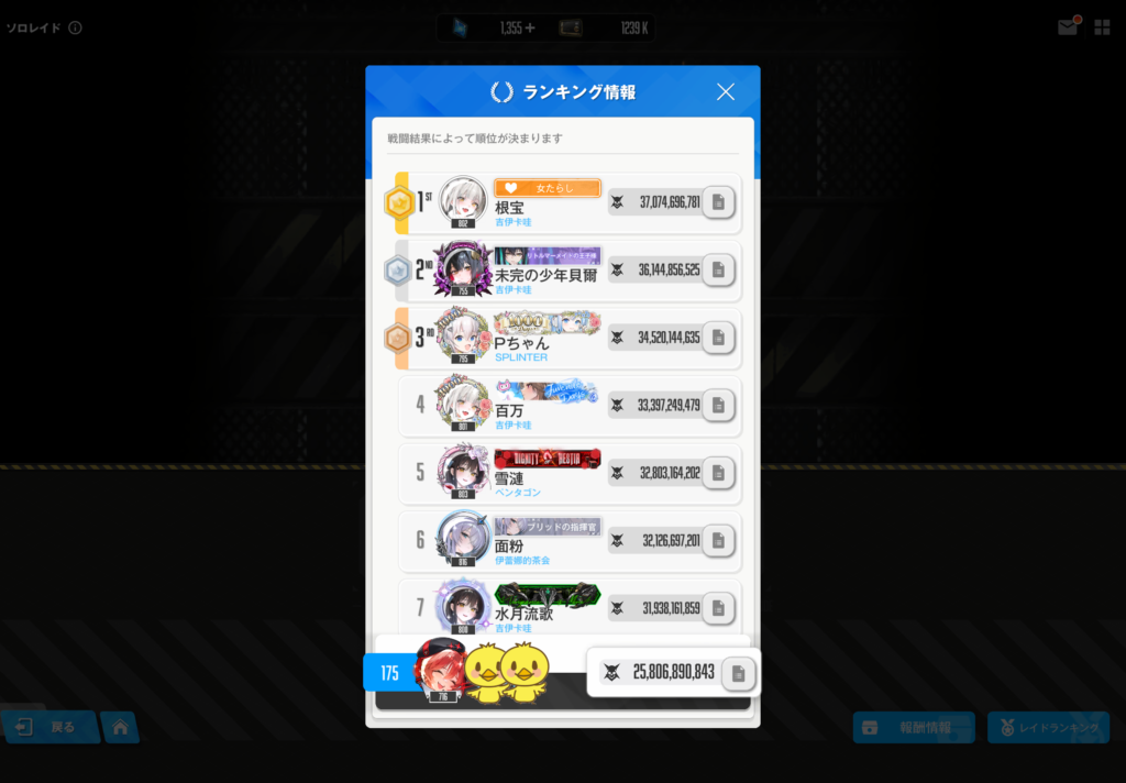 ソロレイド終了時の順位と今回使用した編成